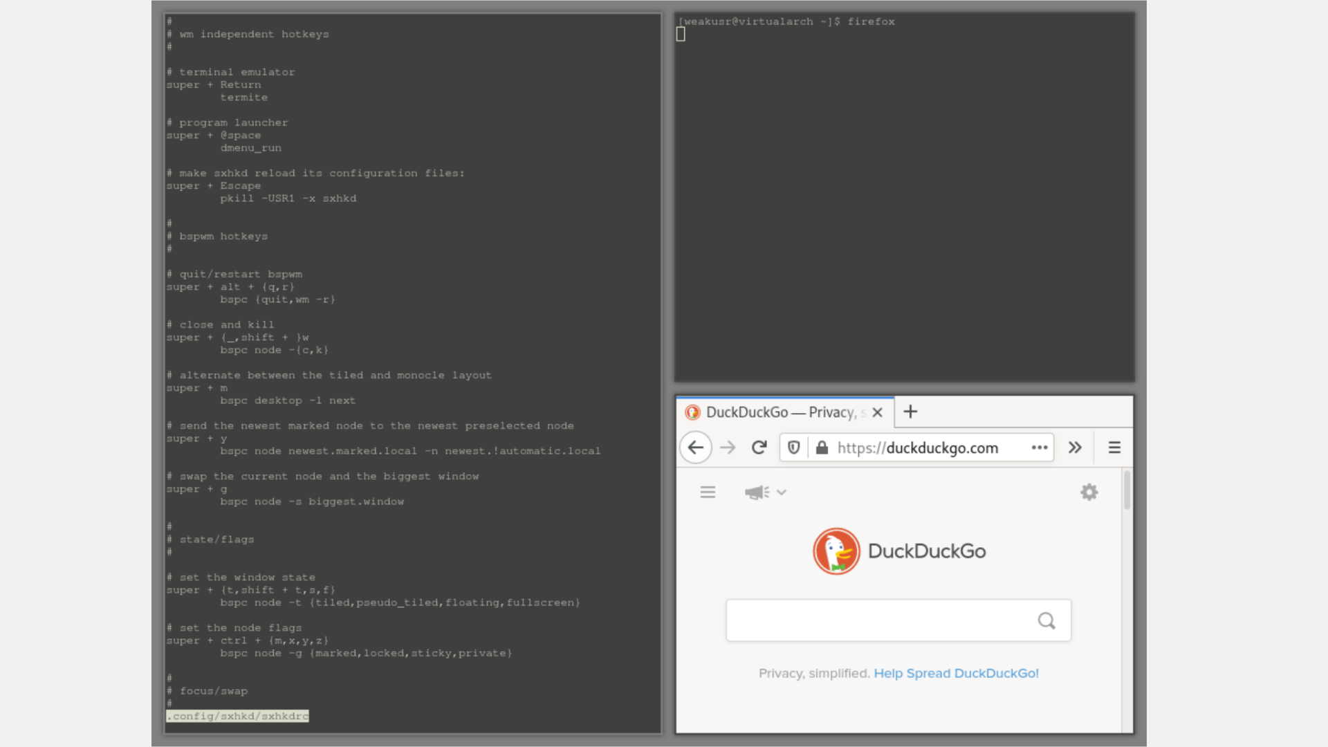 Sometime in early 2021 I became interested in trying out operating systems other than Windows to see what the workflow was like. In the past I had run Ubuntu on a VM but wanted to try something more difficult, so I decided to try installing ArchLinux using VirtualBox, and get a window manager set up, with the goal of getting a web browser working. The installation process took longer than I anticipated (and I failed on my first try, as I messed up when partitioning the virtual hard disk) but it was really satisfying to get it working and have a terminal-only operating system working on my computer. I learned how to use many different command line tools I was previously unfamiliar with, such as pacman (ArchLinux's package manager) and Lynx (a command line web browser, needed for reading the installation instructions). Setting up a window manager after the installation was easy. I chose BSPWN (as seen in the picture) but I later changed it to OpenBox because it felt more familiar to me, as a Windows user. All in all, this project served as as nice distraction from my other projects for a bit and helped me improve my skills using a command line.