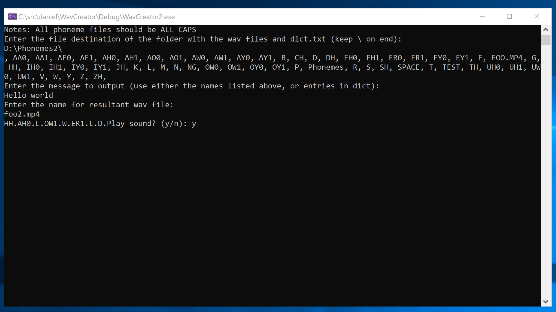 In high school, I took an elective course called "Computer Science III" where I was allowed to independently research topics of my choosing and write programs related to them. I decided to write a text to speech program, and use it as an opportunity to strengthen my knowledge of C++ file I/O and pointers (which was limited at the time, I've learned a lot since then!) My program works by requiring the user to make audio recordings of them uttering all the unique phonemes of the English language (there's about 54 of them, when including different emphases), and using these audio recordings to synthesize words and sentences. The user can write a sentence on the command line, and each word is converted to a set of phonemes using a word-to-phoneme dictionary I found on the Internet, and the resultant string of phonemes are then sequenced into a single .WAV file which is outputted. I recorded myself uttering the ~54 phonemes and found the results to be very robotic, but still surprisingly intelligible!
